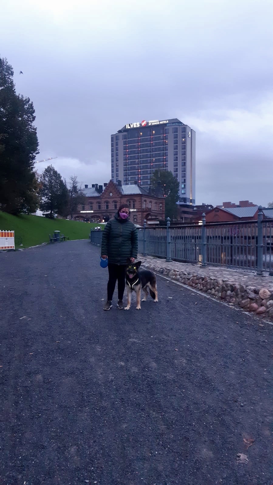 Sitten iltapissalle. Äiti oli vähän pelännyt, että Ilveksessä on huono ympäristö ulkoilla , mutta tästähän pääsi kivasti Tammerkosken rantaa pitkin Koskipuistoon. Tammersiltaan oli tehty tunneli tai ainakaan äiti ei muistanut sellaista olleen ennen. Tietenkin kakkapussit unohdettiin hotellihuoneeseen , mutta tajusin onneksi mennä tiheäoksaisen kuusen juurelle kakalle. Huh , äidin ei tarvinnut hävetä! Anteeksi vielä tästä mokasta kaikille tamperelaisille!