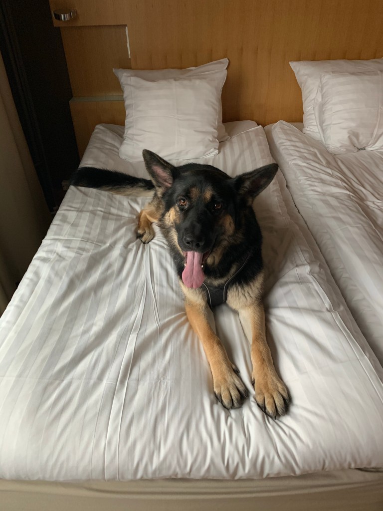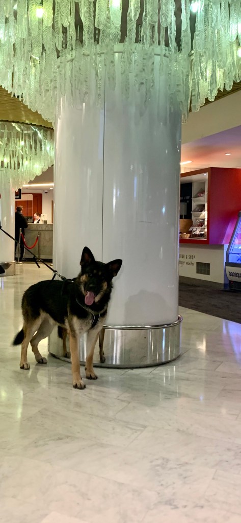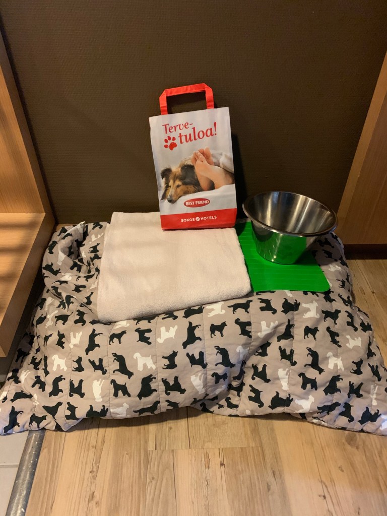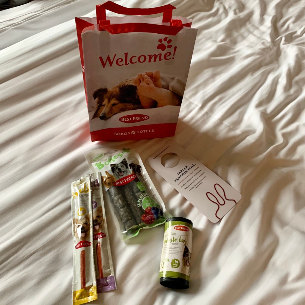 Tampereen Ilvekselle annan koiraystävällisyydestä kymmenen pistettä . Osa asiakkaista oli ihmeissään , osa innoissaan, kun näkivät minut hotellissa. Haluan kuvitella , että ihmiset luulivat minua poliisikoiraksi, joka oli peitetehtävissä Tampereella.