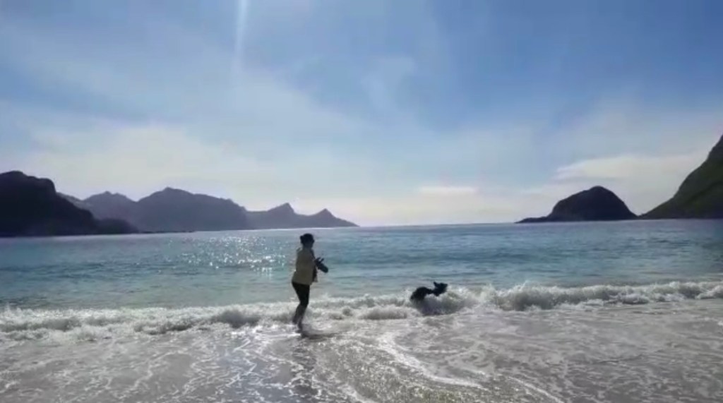 Leknesin lähellä on ihana Hauklandin hiekkaranta. Hotellilta sinne oli noin vartin automatka. Siellä tietenkin käytiin iltalenkillä. Vesi oli uskomattoman lämmintä. Täällä menee kiva kävelyreitti Uttaklievin niemen ympäri. Reitti on helppokulkuinen ja tasainen. Toki täältä löytyy haastavampiakin reittejä. Ne me jätimme ensi kertaa, oli jo sen verran väsy päivän seikkailujen jälkeen.